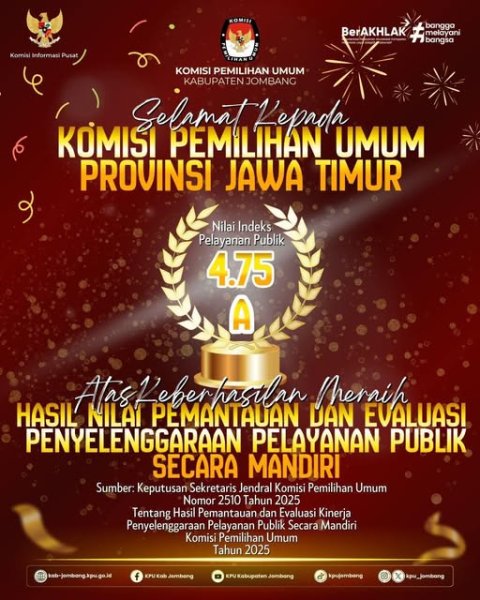 KPU Provinsi Jawa Timur Raih Nilai Pemantauan dan Evaluasi sebesar 4.75 Selasa, 06 Januari 2026 10:27 19 KPU Jombang Mengucapkan Selamat Kepada KPU Provinsi Jawa Timur Atas Keberhasilan Meraih Hasil Nilai Pemantauan dan Evaluasi Penyelenggaraan Pelayanan Publik Secara Mandiri dengan Nilai 4.75 dan kategori A. Baca Selengkapnya