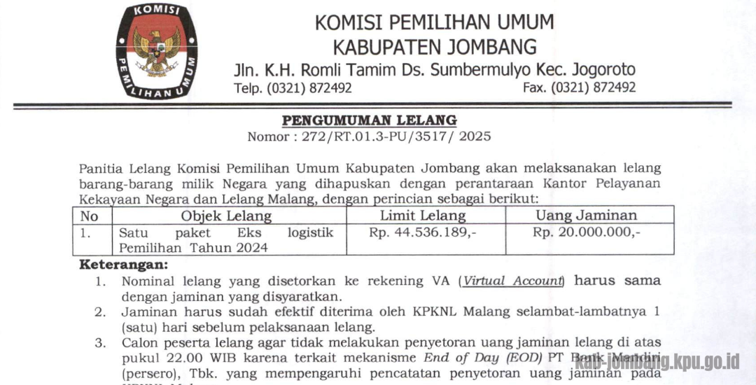 Teman pemilih, dengan ini diumumkan bahwa Komisi Pemilihan Umum Kabupaten Jombang akan menyelenggarakan lelang melalui KPKNL Malang dengan cara open bidding dengan Objek Lalang berupa "Satu Paket Eks Logistik Pemilihan Tahun 2024". Proses lelang akan dilakukan secara online melalui website lelang.go.id dengan batas akhir penawaran lelang tanggal 13 Oktober 2025 pukul 11.00 WIB (waktu server).