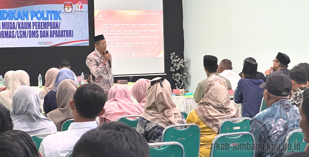 Jombang, kab-jombang.kpu.go.id – dalam rangka meningkatkan partisipasi masyarakat dalam Pemilu dan Pemilihan, Komisi Pemilihan Umum Kabupaten Jombang yang diwakili oleh Nuriadi, Divisi Teknis Penyelenggaraan menghadiri kegiatan Sosialisasi Pendidikan Politik Kepada Masyarakat (Generasi Muda/Kaum Perempuan/Tokoh Agama/Tokoh Masyarakat, ORMAS/LSM/OMS dan Aparatur) yang diadakan oleh Badan Kesatuan Bangsa dan Politik (Bakesbangpol) Kabupaten Jombang.