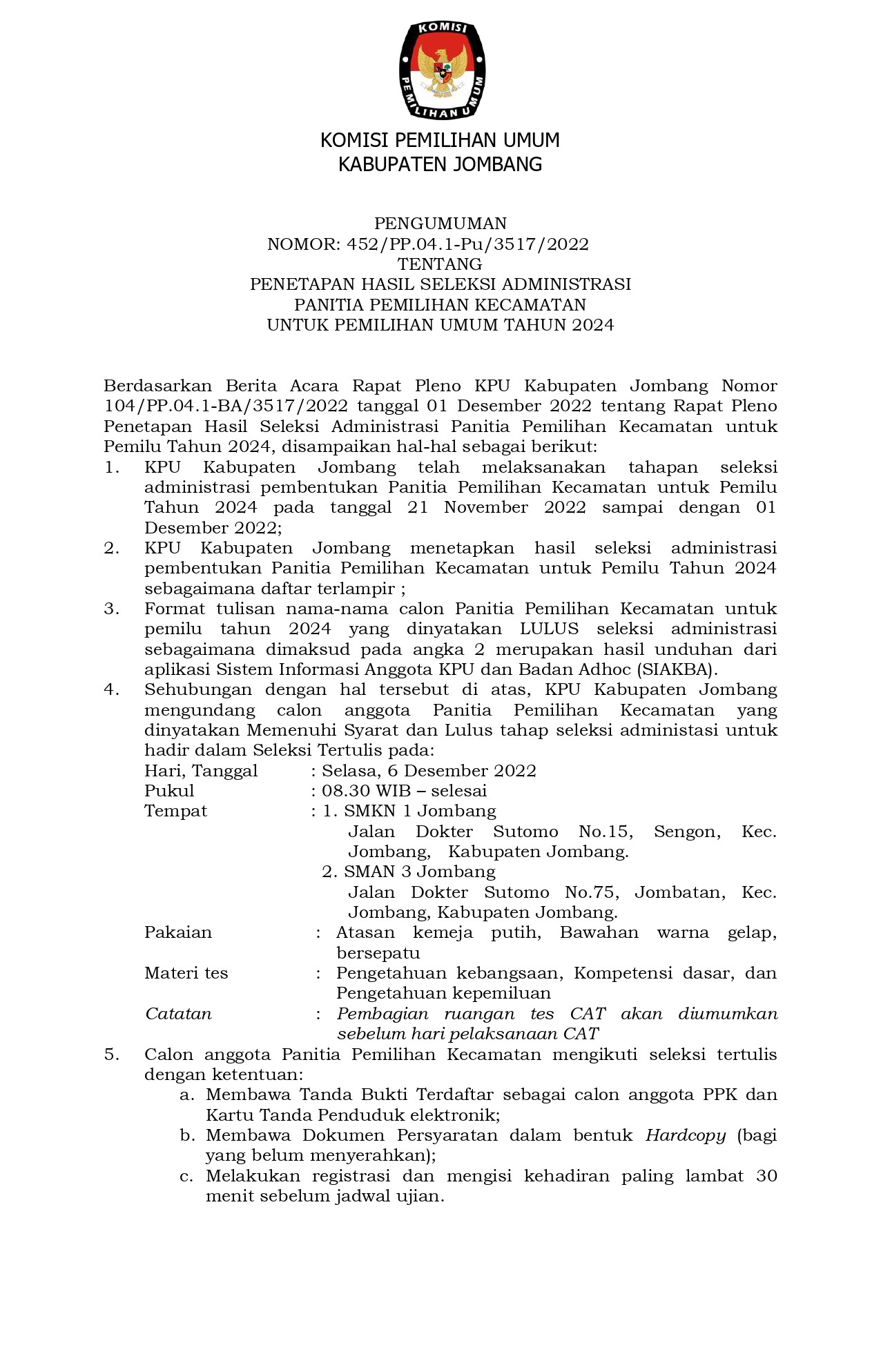 PENGUMUMAN PENETAPAN HASIL SELEKSI ADMINISTRASI PANITIA PEMILIHAN KECAMATAN UNTUK PEMILIHAN UMUM TAHUN 2024 Jumat, 02 Desember 2022 07:00 492 Download Pengumuman Selengkapnya Klik Di sini Bagikan: Telah dilihat 492 kali