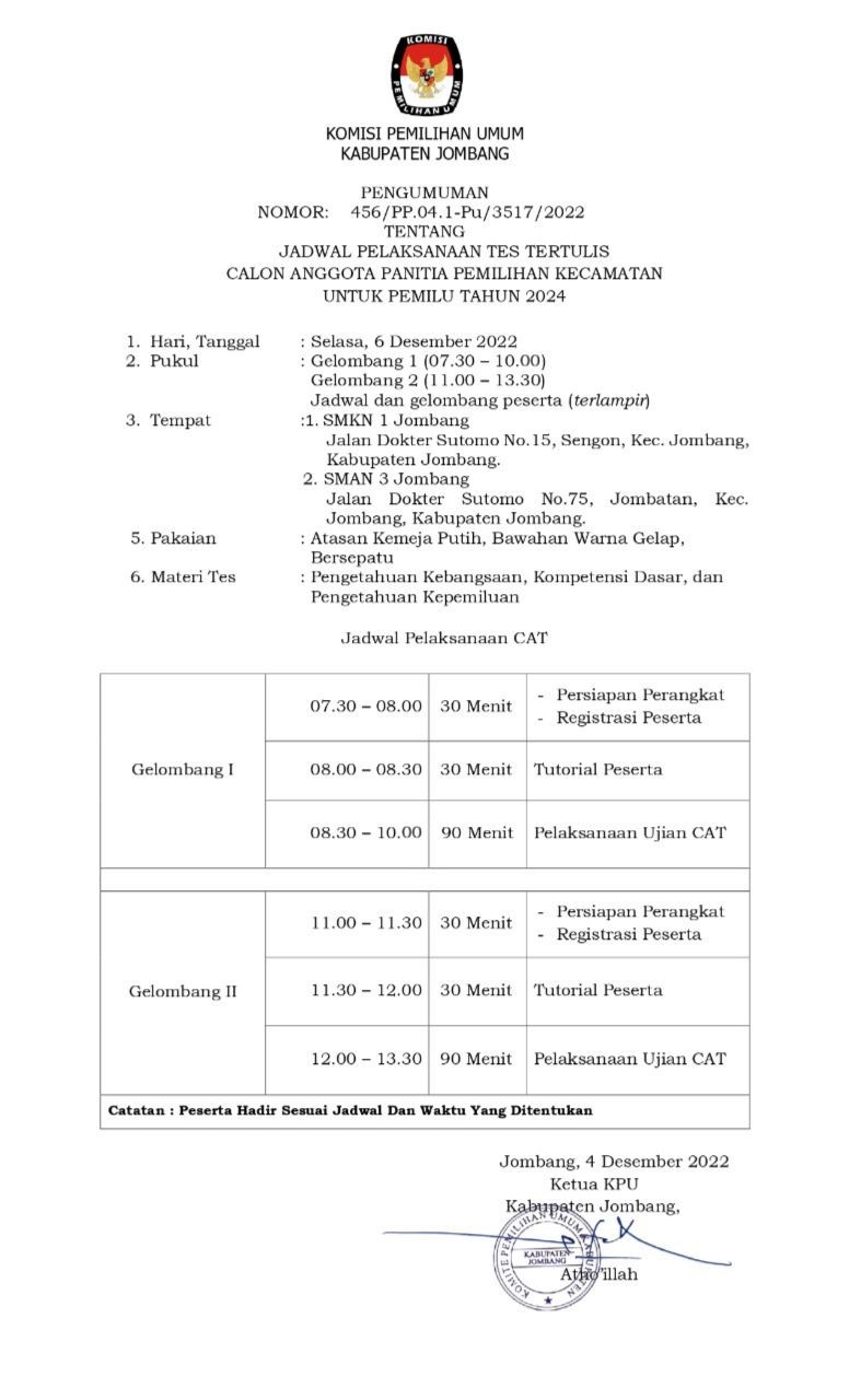 Bersama ini disampaikan Ralat Pengumuman No 456/PP.04.1-Pu/3517/2022 tentang JADWAL PELAKSANAAN TES TERTULIS CALON ANGGOTA PPK PEMILU 2024 bahwa pelaksanaan Tes Tulis CAT Gelombang 1 yang semula dilaksanakan mulai pukul 07.30-10.30 menjadi 07.30-10.00.