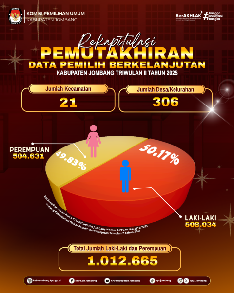 Teman Pemilih, berikut kami sampaikan infografis hasil Rapat Pleno Rekapitulasi Pemutakhiran Data Pemilih Berkelanjutan (PDPB) Triwulan II Tingkat Kabupaten Jombang Tahun 2025 yang dilaksanakan oleh KPU Jombang pada Rabu (02/07/2025).
