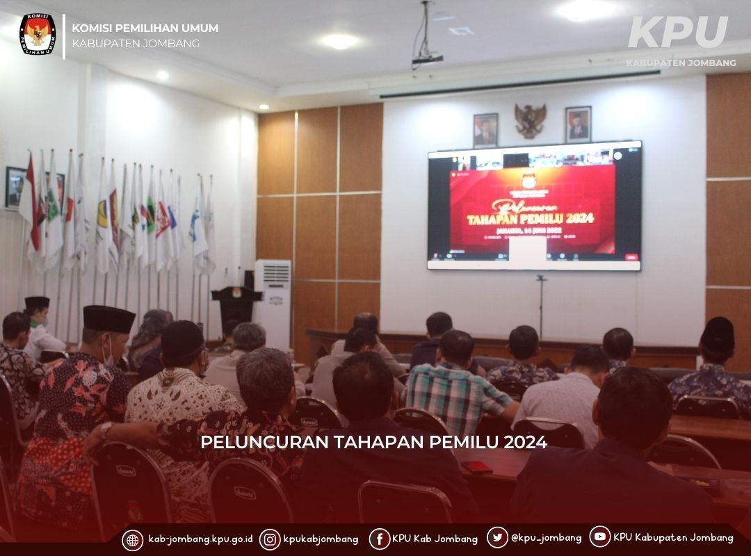 Jombang, kab-jombang.kpu.go.id-KPU Kabupaten Jombang mengikuti Peluncuran Tahapan Pemilu Serentak Tahun 2024 secara Online. Pelaksanaan peluncuran tahapan yang diadakan oleh Komisi Pemilihan Umum Republik Indonesia tersebut diikuti oleh Komisi Pemilihan Umum seluruh Indonesia baik tingkat Provinsi maupun tingkat Kabupaten/Kota pada Rabu (14/6).