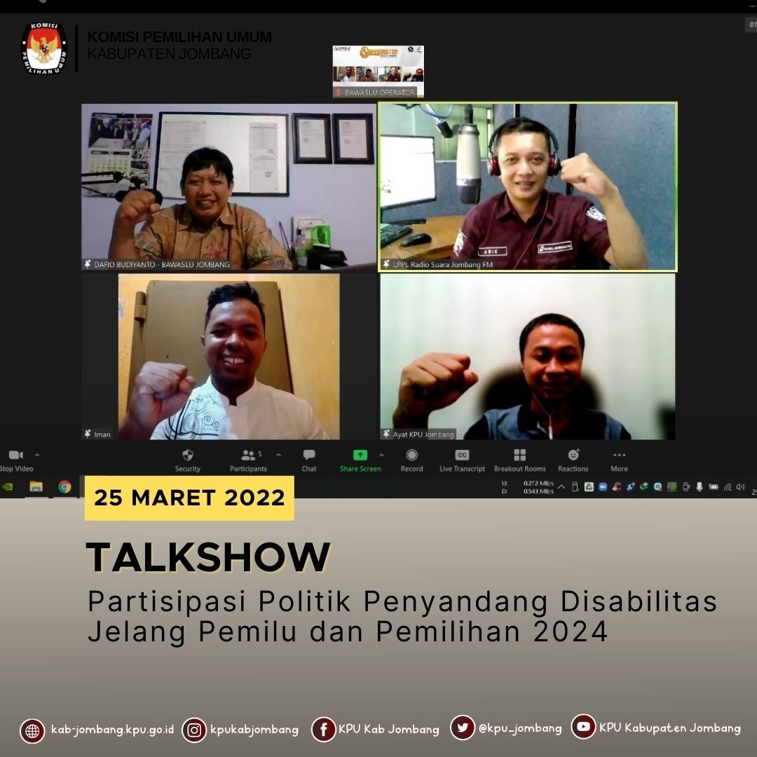 Jombang, kab-jombang.kpu.go.id KPU Kabupaten Jombang mengikuti Rapat Koordinasi Pemutakhiran Daftar Pemilih Berkelanjutan Tahun 2022 pada Sabtu. (26/3/2022). Rapat Koordinasi Daftar Pemilih Berkelanjutan Tahun 2022 dipimpin oleh Divisi Data dan Informasi (Datin) KPU Provinsi Jawa Timur, Nurul Amalia. Dan diikuti oleh Kabag Perencanaan Data dan Informasi (Rendatin), Nurita Paramita; Kasubag Datin, Agus Purwanto; Staf Subbagian Datin KPU Provinsi Jawa Timur serta 114 orang KPU Kabupaten/Kota yang terdiri dari Divisi Rendatin, Kasubag Rendatin dan Operator Sidalih. Dalam rakor kali ini, selain membahas tentang pelaksanaan DPB di masing-masing Kabupaten/Kota, juga sebagai media perkenalan dengan para Kasubag yang baru dilantik di Subbagian Rendatin. “Semoga kawan-kawan Kasubag yang baru menduduki jabatan dapat segera menyesuaikan diri dan mengatur ritme kerja pada Subbagian Rendatin. Hal ini karena tugas di Subbagian Rendatin sangat krusial, sejak awal hingga akhir tahapan dan tidak mengenal waktu. Diharapkan kawan-kawan Kasubag mudah untuk dihubungi sehingga bila ada permasalahan yang urgent dapat segera ditindak lanjuti”, tegas Nurul. Disamping perkenalan tersebut, Nurul Amalia sebagai Pimpinan Divisi Data dan Informasi juga menegaskan pentingnya Pemutakhiran Daftar Pemilih (DPT) karena menyangkut proses tahapan pemilu, mulai dari penyediaan anggaran, penyediaan logistic kebutuhan pemilu dan pengalokasian logistic serta pemetaan TPS hingga saat proses pemilu berlangsung. Adapun evaluasi yang dilakukan terkait dengan pemenuhan data yang diminta oleh provinsi, yaitu pemetaan TPS, input daftar pemilih yang hadir di TPS, dan sanding data pemilih nonpadan dengan pemilih hadir di TPS. Sedangkan untuk beberapa Kabupaten/Kota yang masih memiliki data pemilih ganda untuk segera dilakukan perbaikan pada aplikasi Sidalih. (dras/progdat).