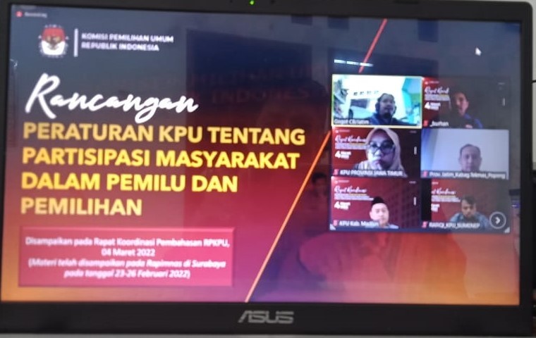 Jombang, kab-jombang.kpu.go.id – KPU Kabupaten Jombang Ikuti Rapat Koordinasi Pembahasan Rancangan PKPU tentang Partisipasi Masyarakat yang digelar KPU Provinsi Jawa, dalam rangka persiapan pelaksanaan tahapan sosialisasi dan pendidikan pemilih guna peningkatan partisipasi masyarakat pada Pemilu/Pemilihan Serentak Tahun 2024, yang dihadir Anggota KPU Divisi Sosdiklih, Parmas dan SDM, beserta Penata Kelola Pemilu Ahli Muda pada Subbagian Tekmas dari 38 KPU Kabupaten/Kota se-Jawa Timur, secara daring via zoom meeting,Jum’at (4/3).