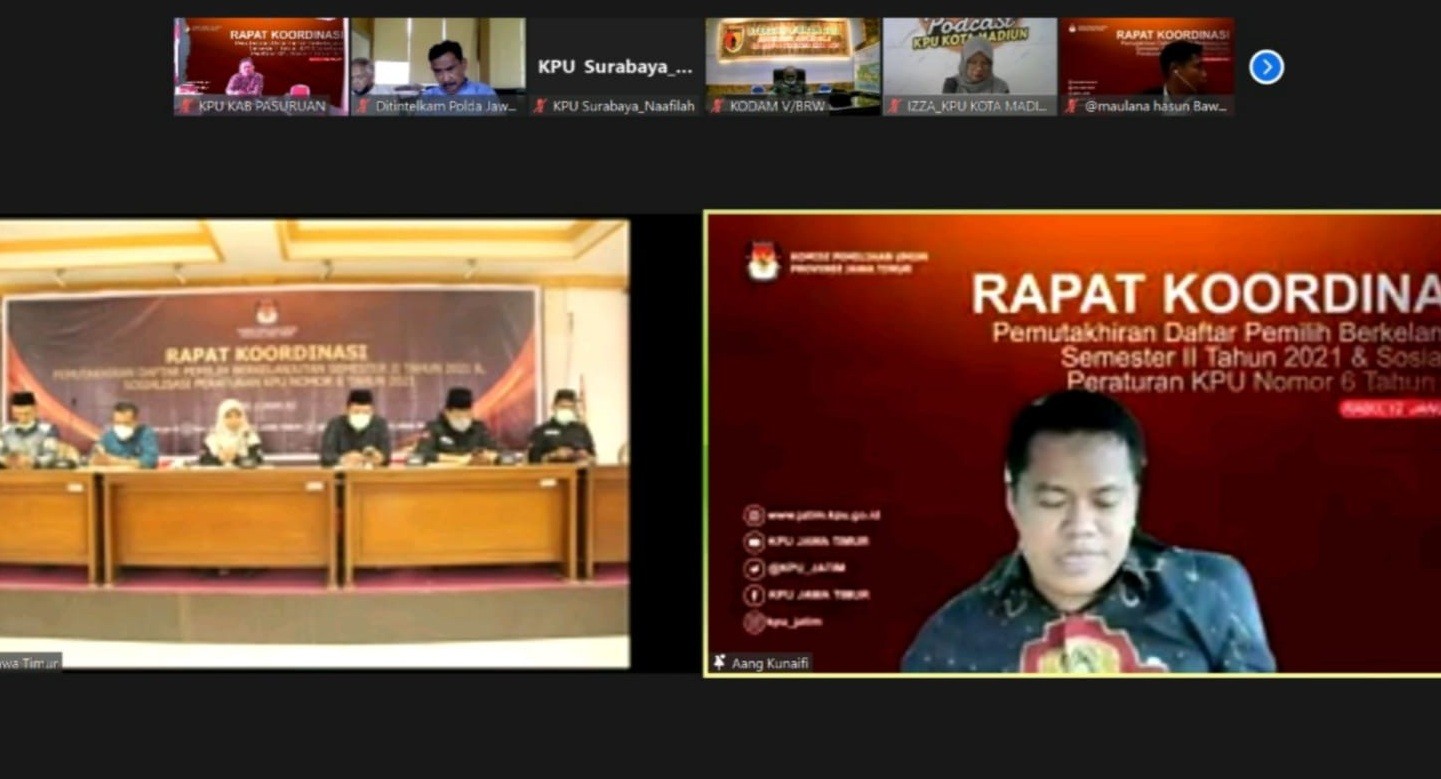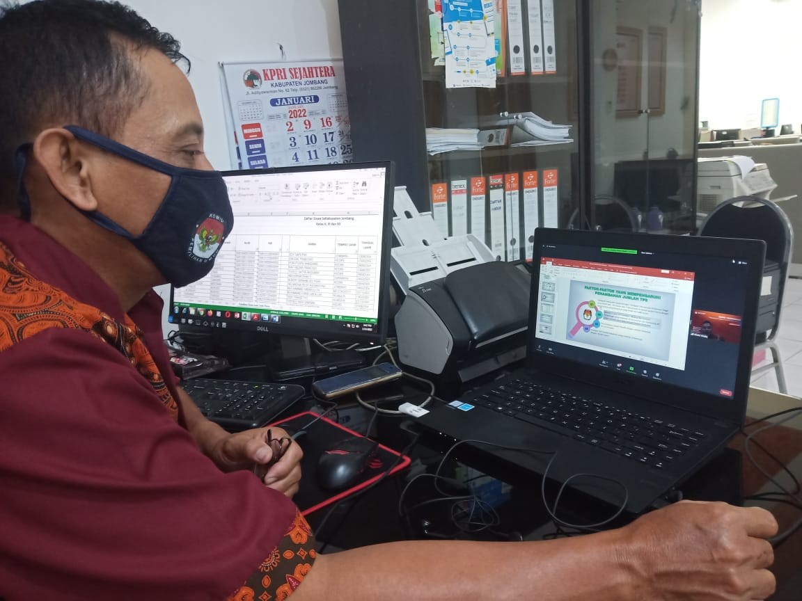 Jombang, kab-jombang.kpu.go.id – Anggota KPU sekaligus Ketua Divisi Perencanaan Data dan Informasi KPU Kabupaten Jombang, Abdul Wadud Burhan Abadi, dan Operator Sidalih, Samsul Hudha, mengikuti Rapat Koordinasi Pemutakhiran Data Pemilih Berkelanjutan Tahun 2022 oleh KPU Provinsi Jawa Timur melalui jaringan online zoom, Jumat (14/1), mulai pukul 13.00 WIB sampai selesai. Rapat koordinasi ini bertujuan untuk melakukan pemetaan Tempat Pemungutan Suara (TPS) untuk Pemilu 2024.