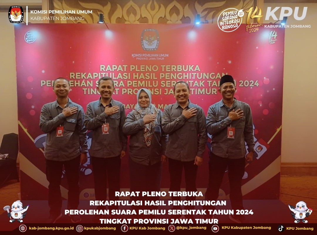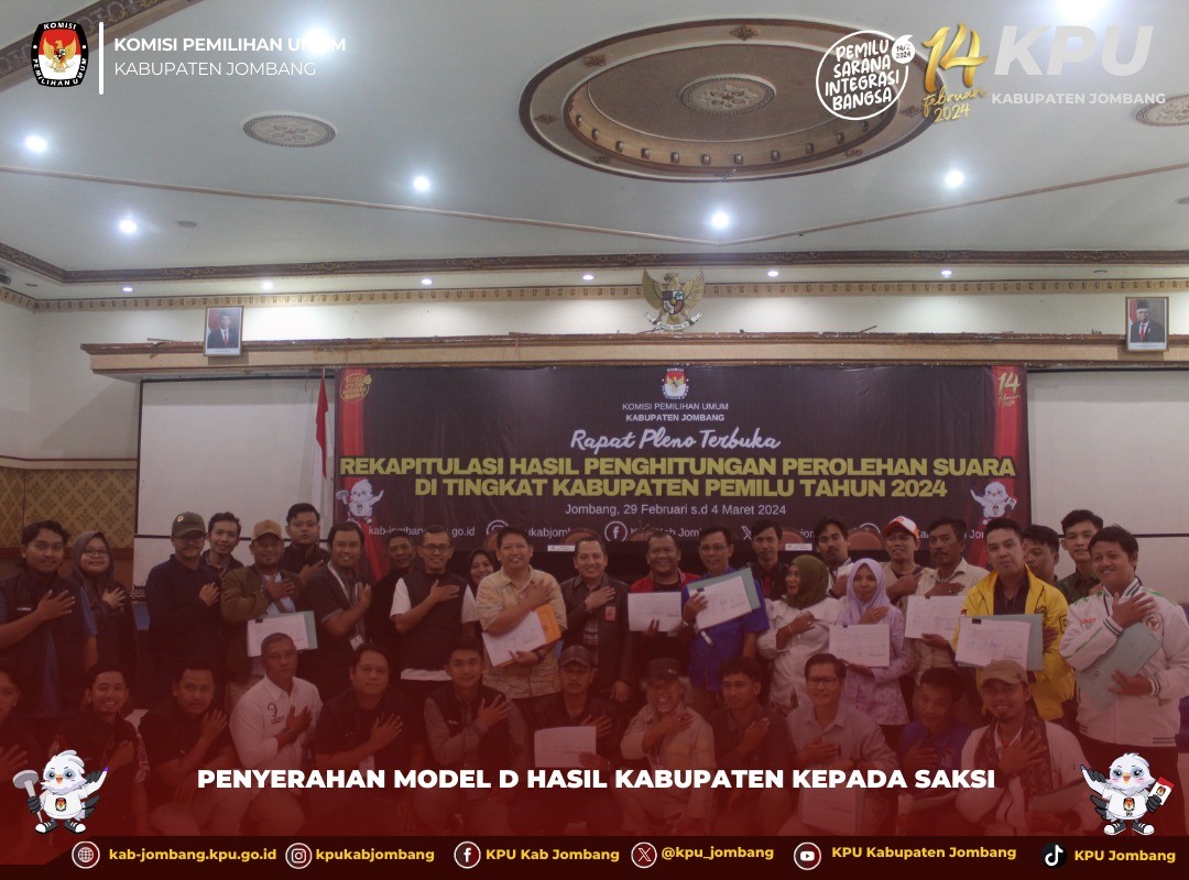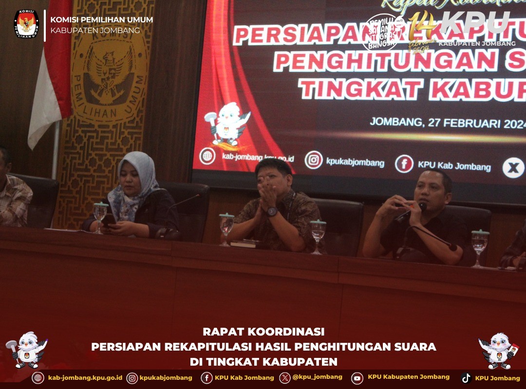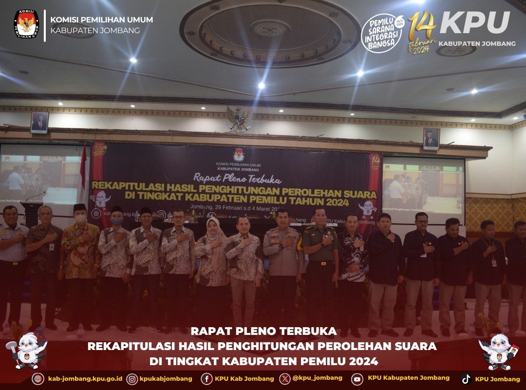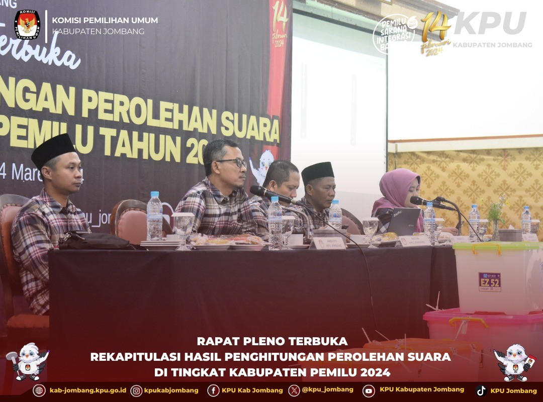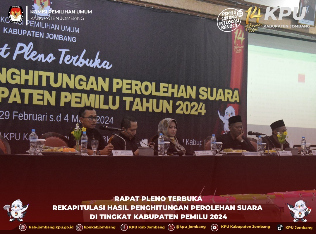 Jombang, kab-jombang.kpu.go.id KPU Jombang gelar Rapat Pleno Terbuka Rekapitulasi Hasil Penghitungan Perolehan Suara Tingkat Kabupaten Pemilu Tahun 2024, Kamis (29/2/ 2024).