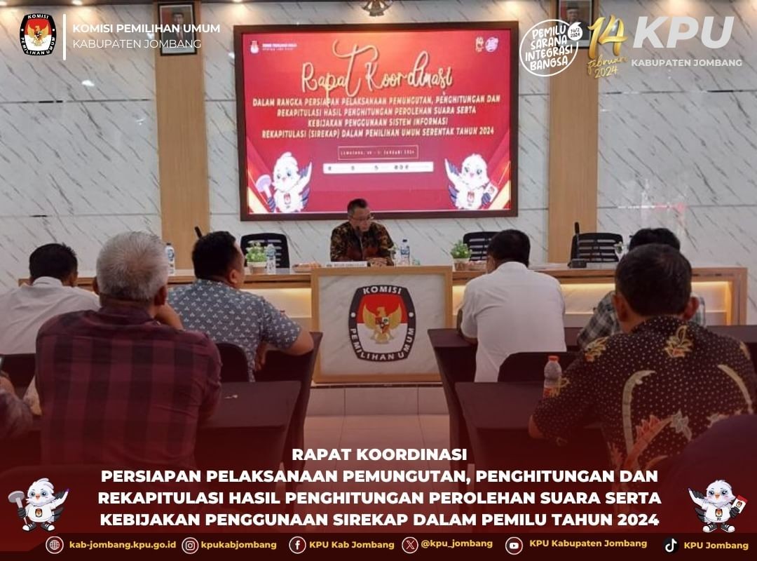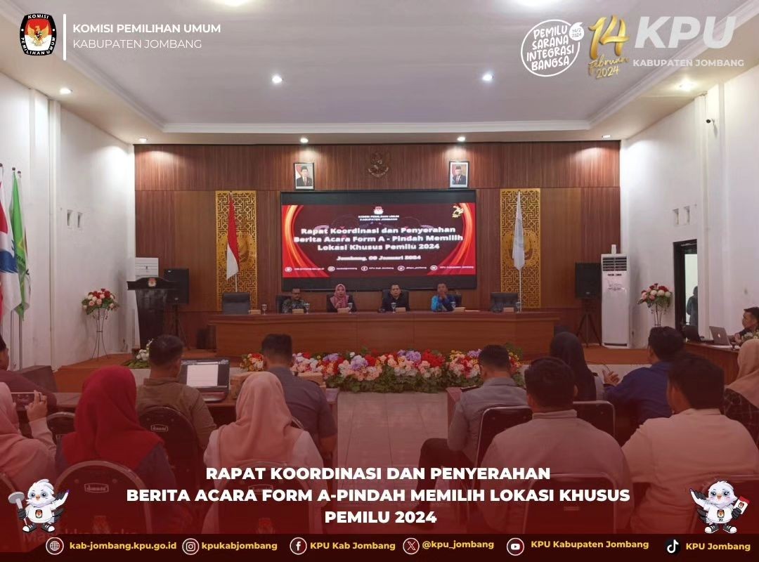 Jombang, kab-jombang.kpu.go.id Komisi Pemilihan Umum (KPU) Kabupaten Jombang gelar Rapat Koordinasi dan Penyerahan Berita Acara Form A-Pindah Memilih di Lokasi Khusus Pemilu Tahun 2024, Selasa (9/1/2024).