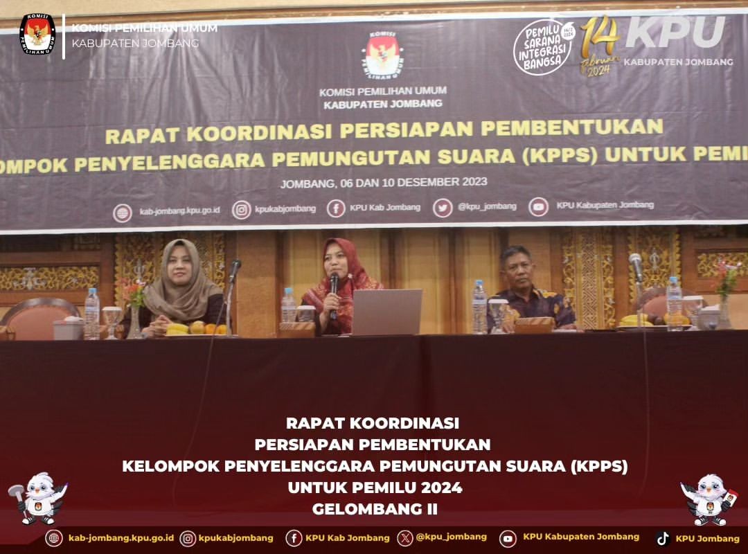 Jombang, kab-jombang.kpu.go.id –KPU Kabupaten Jombang gelar Rapat Koordinasi Persiapan Pembentukan Kelompok Penyelenggara Pemungutan Suara (KPPS) Untuk Pemilu 2024 Gelombang II, Minggu (10/12/ 2023) di Hotel Yusro Jombang.