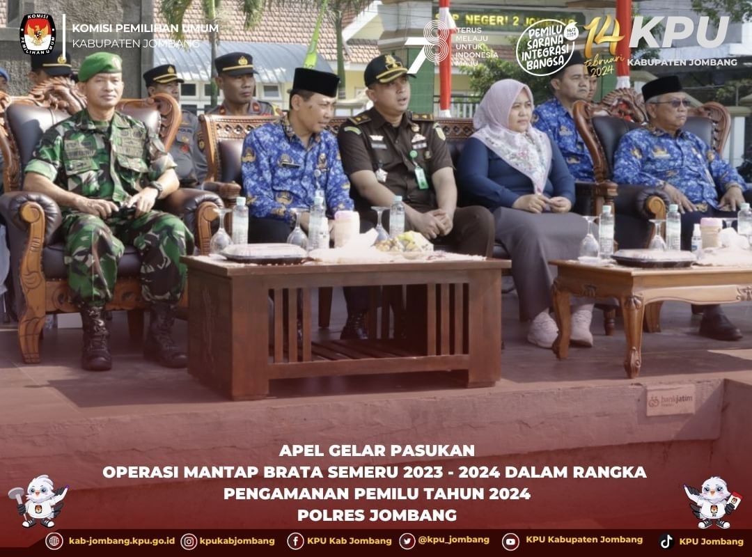 Kegiatan Apel Gelar Pasukan Operasi Mantap Brata Semeru tahun 2023 dilaksanakan dalam rangka pengamanan pemilu 2024. Apel dipimpin Waka Polres Jombang Kompol Hary Kurniawan, SH. Hadir mewakili dari KPU Jombang, Sosdiklih, Parmas, dan SDM, Rita Darmawati. Turut hadir pula Kajari, Sekretaris Daerah, Asisten 2, Pasi Ops Kodim 0814, Kasubbantek Satrad 222/Ploso, Dan UP3M, Kepala Bakesbangpol, PJU Polres, Bawaslu, dan Perwakilan PPK se Kabupaten Jombang.