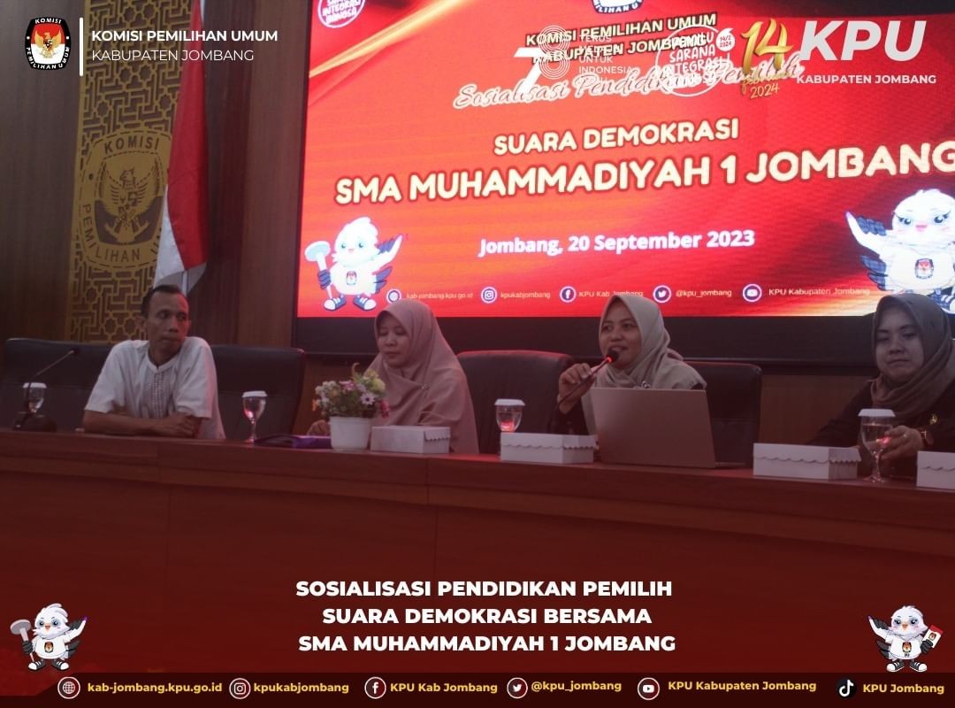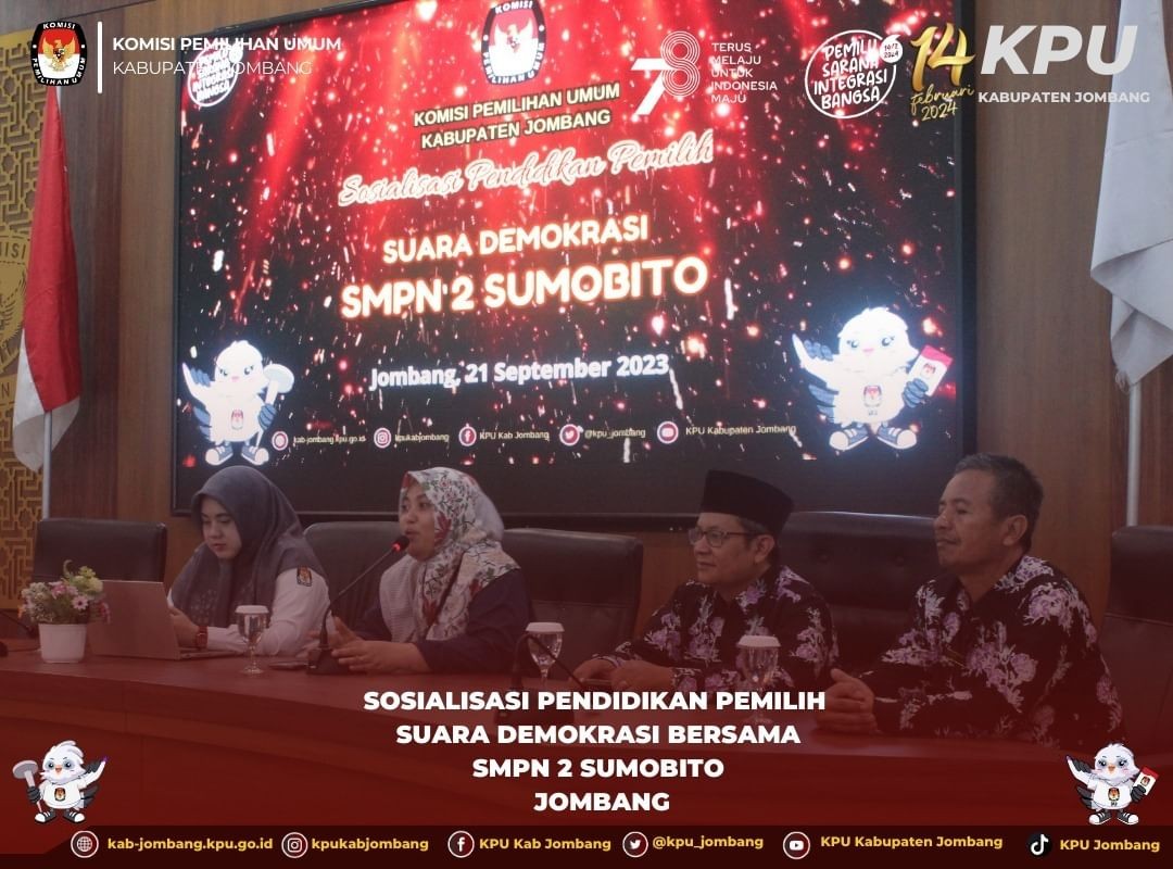 Jombang, kab-jombang.kpu.go.id Dalam rangka pelaksanaan pembelajaran Projek Penguatan Profil Pelajar Pancasila (P5), KPU Jombang menerima kunjungan siswa-siswi SMPN 2 Sumobito pada hari Kamis (21/9/2023) di Gedung Husni Kamil Manik, Jl. KH Romly Tamim, Jogoroto, Jombang. Sebanyak 214 peserta didik mengikuti kegiatan ini dengan penuh semangat. Acara dimulai dengan menyanyikan lagu kebangsaan Indonesia Raya dan dilanjutkan dengan menyanyikan Jingle Pemilu. “Tujuan kedatangan kami ke KPU Jombang yaitu kami berharap agar peserta didik kami mendapatkan informasi, wawasan, dan pengetahuan terkait demokrasi dan kepemiluan karena sebentar lagi anak-anak akan melaksanakan pemilihan ketua Osis”, tutur Bambang Djoko Soejono, Kepala Sekolah SMPN 2 Sumobito. Rita Darmawati, Anggota KPU Jombang Divisi Sosdiklih, Parmas, dan SDM mengatakan di depan ratusan siswa SMP bahwa sudah menjadi tugas KPU untuk melakukan sosialisasi Pendidikan pemilih sejak dini. “Terimakasih adik-adik telah berkunjung ke Kantor KPU Jombang, kami sangat senang karena adik-adik ini akan melakukan pesta demokrasi di tingkat sekolah untuk pemilihan ketua OSIS. Tepat sekali adik-adik bisa belajar proses demokrasi secara langsung di KPU Jombang” ujar Rita saat membuka acara. Selanjutnya, materi seputar demokrasi dan kepemiluan disampaikan oleh Dina Triasmadji, Kasubbag Teknis dan Hupmas. Siswa-siswi SMPN 2 Sumobito sangat antusias mengikuti pembelajaran dari awal hingga akhir. Kegiatan ini diakhiri dengan penukaran cenderamata dan foto bersama. (nf/humas)