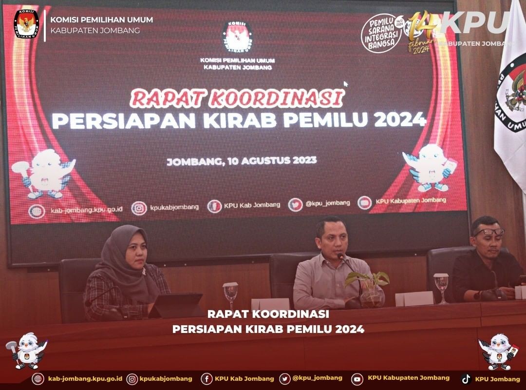 Jombang, kab-jombang.kpu.go.id Komisi Pemilihan Umum (KPU) Kabupaten Jombang gelar Rapat Koordinasi Persiapan Kirab Pemilu Tahun 2024 pada hari Kamis (10/8/2023) di Gedung Husni Kamil Manik. Hadir dalam rapat kali ini, Panitia Pemilihan Kecamatan (PPK) Divisi Sosdiklih, Parmas, dan SDM se Kabupaten Jombang.