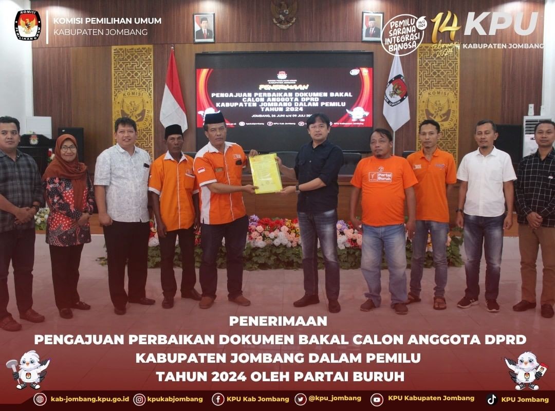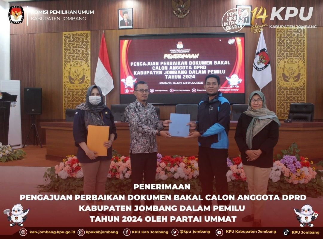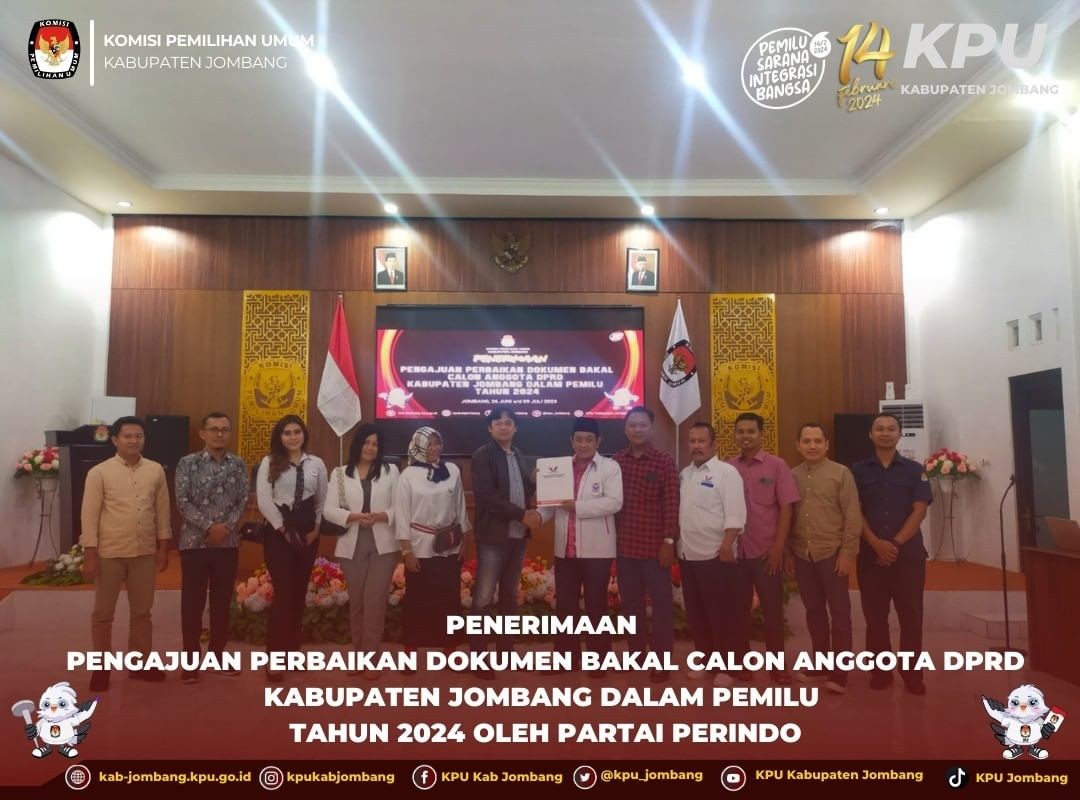 Jombang, kab-jombang.kpu.go.id KPU Kabupaten Jombang menerima pengajuan perbaikan dokumen persyaratan bakal calon anggota DPRD Kabupaten Jombang pada Pemilu 2024 oleh Partai Perindo, Sabtu, (8/7/2023) bertempat di Gedung Husni Kamil Manik, Jl. KH Romly Tamim Jogoroto, Jombang.