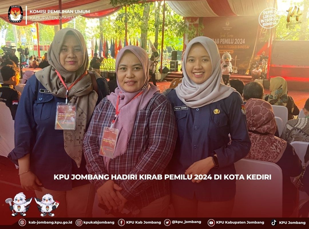 Jombang, kab-jombang.kpu.go.id Komisi Pemilihan Umum (KPU) Kabupaten Jombang diwakili oleh Divisi Sosdiklih, SDM, dan Parmas, Rita Darmawati, Kasubbag Teknis dan Hupmas, Dina Triasmadji, beserta Staf hadiri Kirab Pemilu 2024 di Taman Sekartaji, Kota Kediri, Sabtu (24/6/2023).