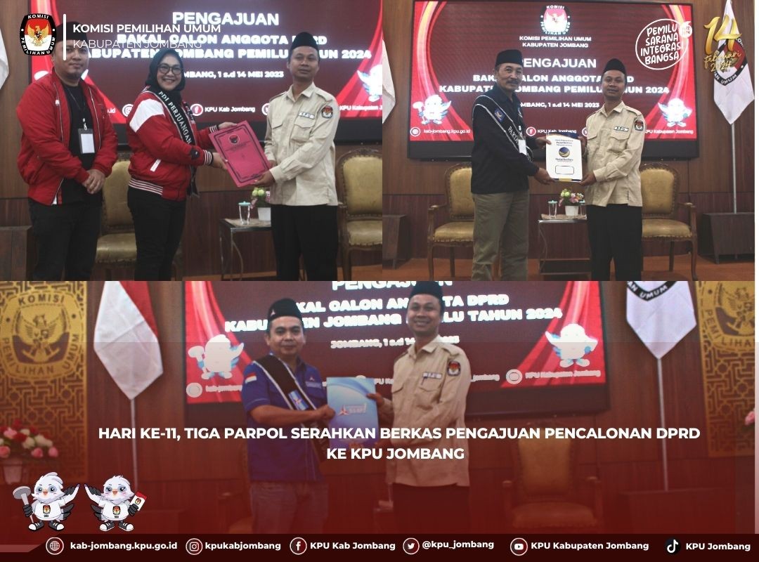 Jombang, kab-jombang.kpu.go.id Hari ke 11 pengajuan bakal calon, partai politik peserta Pemilu 2024 di Kabupaten Jombang yang menyerahkan berkas pengajuannya hanya baru 3 partai. Ketiga partai tersebut adalah PDI Perjuangan, Partai Nasdem, dan Partai Demokrat. Ketiganya, menyerahkan di hari yang sama, Kamis (11/5).
