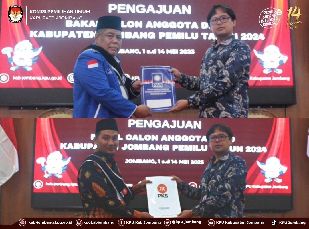 Pada kesempatan yang sama, Plh. Ketua KPU Jombang Ayatulloh Khumaini menyampaikan, penyerahan berkas pengajuan anggota DPRD oleh partai politik akan berlangsung hingga tanggal 14 Mei 2023. “Hari ini merupakan hari ke 11. KPU Jombang akan menerima berkas pengajuan anggota DPRD dari partai politik hingga 14 Mei ini,” tandas Ayatulloh ketika menjawab pertanyaan sejumlah wartawan.