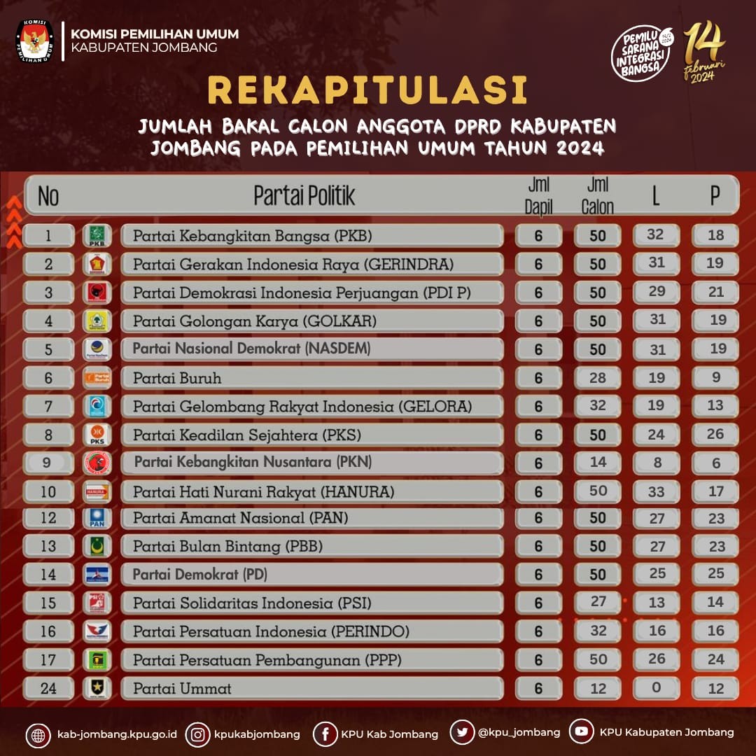 Sesuai hasil konfirmasi yang diterima KPU Jombang, PDI Perjuangan menyerahkan berkas pengajuan bakal calon anggota DPRD pada urutan yang pertama, disusul Partai Nadem dan dilanjutkan Partai Demokrat. KPU Jombang menerima berkas pengajuan dari ketiga partai politik secara seremonial di gedung pertemuan Husni Kamil Manik (HKM).