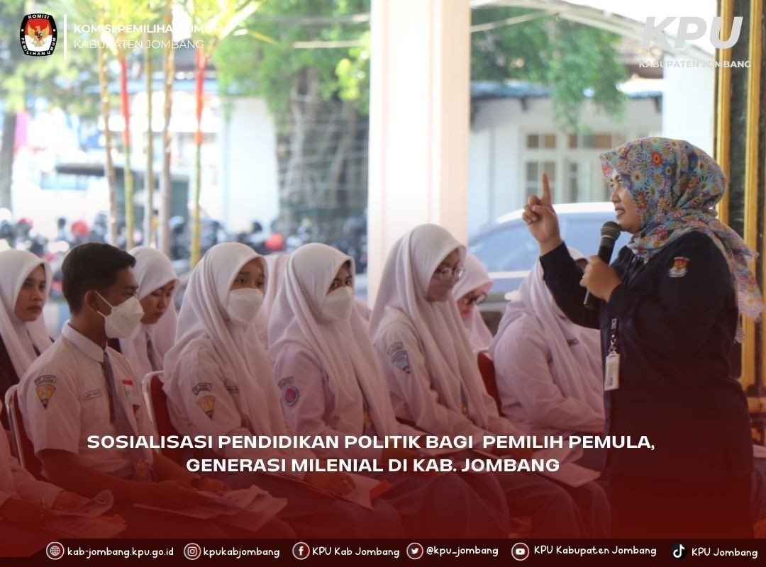 Jombang, kab-jombang.kpu.go.id - Komisi Pemilihan Umum Kabupaten Jombang (KPU Jombang) menghadiri kegiatan Sosialisasi Pendidikan Politik, bagi Pemilih Pemula, Generasi Milenial. Kegiatan sisialisasi dengan peserta pelajar SMA tersebut diadakan di Pendopo Kabupaten Jombang. Kegiatan yang dilaksanakan pada Senin (9/9/22) itu dihadiri oleh Bupati Jombang Hj. Mundjidah Wahab, dan Asisten.