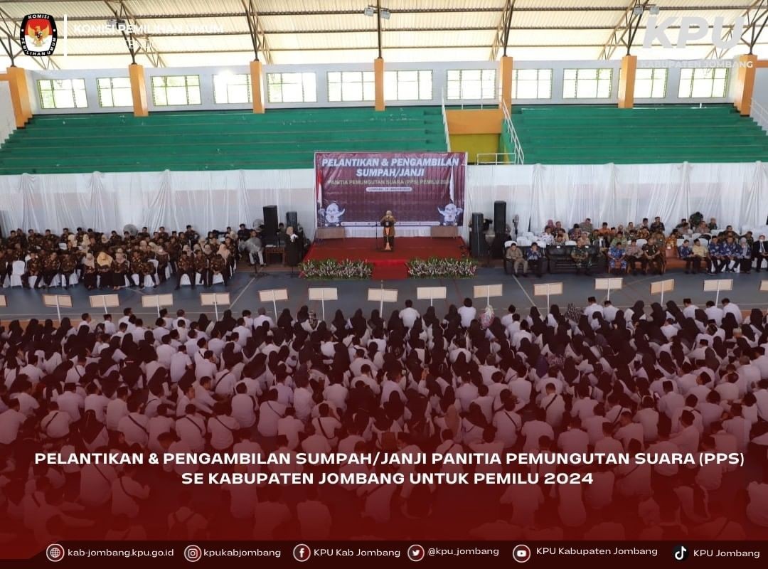 Jombang, kab-jombang.kpu.go.id – Ketua Komisi Pemilihan Umum Kabupaten Jombang melantik 918 orang Panitia Pemungutan Suara (PPS) Pemilihan Umum (Pemilu) 2024 pada Selasa (24/1). Pelaksanaan pelantikan tersebut digelar di GOR Merdeka Kabupaten Jombang. Dengan jumlah peserta yang hampir mencapai angka seribu, KPU Jombang berinisiatif memberikan penjagaan terbaik dengan lebih ketat dari biasanya. Selain polisi, beberapa tenaga keamanan internal KPU Jombang pun turut dikerahkan. Seperti yang disampaikan oleh Bupati Jombang, Mundjidah Wahab, "Kami tentunya berharap Kabupaten Jombang siap melaksanakan Pemilu tahun 2024 yang berkualitas dan bermartabat, tidak hanya sisi pelaksanaannya yang sukses dan lancar, akan tetapi kondusifitas daerah juga terjaga", pungkasnya. Dengan begitu, diharapkan pelaksanaan pelantikan dapat berjalan dengan lancar. Sehingga peserta dan pelaksana pelantikan dapat memperhatikan instruksi yang disampaikan. Turut hadir dalam pertemuan, Komisioner KPU Kabupaten Jombang dan Sekretariat KPU Kabupaten Jombang, Bupati Jombang, Forkopimda Kabupaten Jombang, Bawaslu Kabupaten Jombang dan instansi terkait serta Panitia Pemilihan Kecamatan (PPK) se-Kabupaten Jombang. (dt/humas)