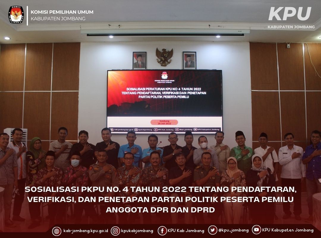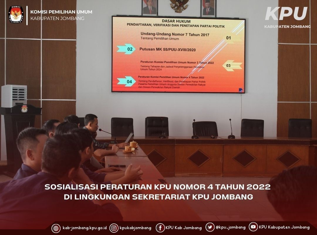 Jombang, kab-jombang.kpu.go.id - Komisi Pemilihan Umum (KPU) Kabupaten Jombang setelah melaksanakan sosialisasi Peraturan KPU Nomor 4 Tahun 2022 dilingkup internal KPU Kabupaten Jombang segera bergegas melaksanakan sosialisasi kedua yang melibatkan calon peserta Pemilihan Umum (Pemilu) dan stakeholder serta instansi terkait. (28/7/2022) ”Maksud diadakan sosialisasi baik di lingkup internal dan eksternal ini adalah sebagai bentuk tindak lanjut bimbingan teknis yang sudah diikuti oleh KPU Kabupaten Jombang pada tanggal 23 - 25 Juli 2022 yang lalu dan dalam rangka menyamakan persepsi dan pemahaman terkait Peraturan KPU Nomor 4 Tahun 2022 tentang Pendaftaran, Verifikasi, dan Penetapan Partai Politik Peserta Pemilu Anggota DPR dan DPD,” papar As’ad. Sosialisasi digelar di gedung Husni Kamil Manik KPU Kabupaten Jombang, Jalan KH. Romly Thamim Sumbermulyo Jogoroto Jombang mulai pukul 14.00 WIB dan berakhir tepat pukul 16.30 WIB. Selain parpol calon peserta Pemilu Tahun 2024, kegiatan kali ini mengundang stakeholder terkait yaitu pihak Pemkab Jombang, Bawaslu Kabupaten Jombang, Polres Jombang, Kodim 0814, Badan Badan Kesatuan Bangsa dan Politik (Bakesbangpol), Disdukcapil, Akademisi dan Ormas. Turut hadir pula dari jajaran KPU Kabupaten Jombang, Ketua, Anggota, Sekretaris dan jajaran sekretariat KPU Kabupaten Jombang Dalam penjelasannya Ketua KPU Kabupaten Jombang, Athoillah mengungkapkan, kegiatan Sosialisasi Pendaftaran, Verifikasi, dan Penetapan Parpol Peserta Pemilu Anggota DPR dan DPRD Tahun 2024 melalui undangan terbuka di website dan semua platform media sosial resmi KPU Jombang. “Undangan terbuka disampaikan dikarenakan KPU Kabupaten Jombang belum memiliki alamat parpol baru dan nomor kontak secara keseluruhan parpol yang ada di Kabupaten Jombang. Kecuali parpol yang sudah pernah melakukan audiensi ke KPU Jombang,” tandas Athoillah. Pada sesi materi, Divisi teknis penyelenggaraan KPU Kabupaten Jombang, As’ad Choiruddin mengatakan Peraturan Komisi Pemilihan Umum (PKPU) Nomor 4 Tahun 2022 ini mengatur peserta pemilu yang berasal dari parpol. Sesuai dengan PKPU 4 Tahun 2022, pengumuman pendaftaran parpol calon peserta pemilu pada tanggal 29-31 Juli 2022. Sementara pendaftaran dan penyampaian dokumen pendaftaran oleh parpol tanggal 1-14 Agustus 2022. “Berbeda dengan proses pendaftaran parpol calon peserta pemilu pada Pemilu Tahun 2019, tempat pendaftaran Pemilu Tahun 2024 ada di tingkat pusat oleh parpol tingkat pusat serta semua berkasnya diunggah melalui Sistem Informasi Partai Politik (Sipol),” jelas As’ad. Kemudian penyampaian rekapitulasi hasil verifikasi administrasi kepada parpol dan Bawaslu 14 September 2022 dan masa perbaikan dokumen persyaratan dan penyampaian dokumen persyaratan perbaikan oleh parpol 15 - 28 September 2022. Berikutnya, verifikasi administrasi perbaikan 29 September - 12 Oktober 2022, penyampaian dan pengumuman rekapitulasi hasil verifikasi administrasi kepada parpol dan Bawaslu 14 Oktober 2022. Sedangkan verifikasi faktual kepengurusan dan keanggotaan akan dilaksanakan tanggal 15 Oktober - 4 November 2022. Penyampaian rekapitulasi hasil verifikasi faktual kepengurusan dan keanggotaan kepada parpol dan Bawaslu 9 November 2022 dan masa perbaikan persyaratan kepengurusan dan keanggotaan serta penyampaian dokumen persyaratan perbaikan oleh parpol 10-23 November 2022. Setelah itu dilanjutkan verifikasi faktual perbaikan persyaratan kepengurusan dan keanggotaan parpol 24 November - 7 Desember 2022. Kegiatan ini kemudian ditutup dengan sesi foto bersama oleh segenap undangan dan pengambilan video untuk dokumentasi KPU Kabupaten Jombang. (dt/humas)