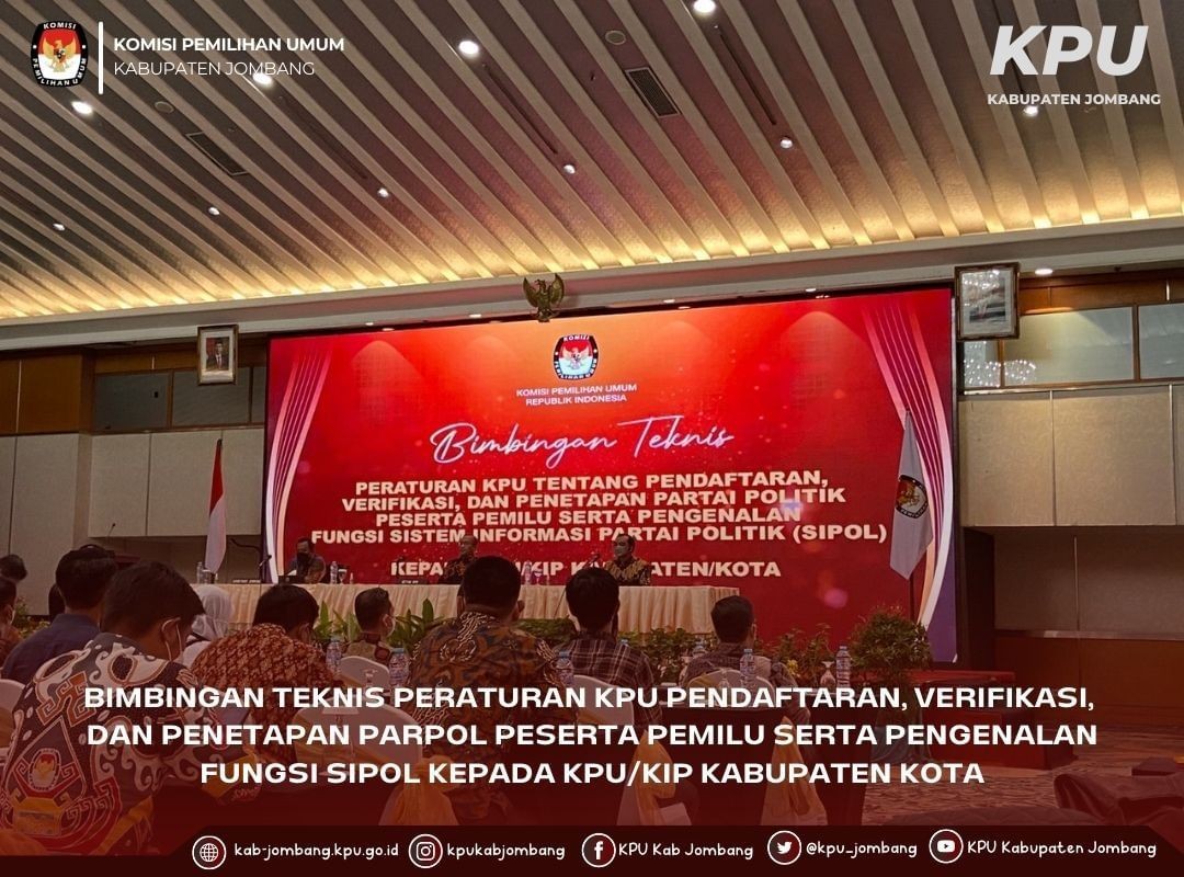 Jombang, kab-jombang.kpu.go.id – Komisi Pemilihan Umum (KPU) Kabupaten Jombang mengikuti Bimbingan Teknis Peraturan KPU tentang Pendaftaran, Verifikasi, dan Penetapan Partai Politik Peserta Pemilu serta Pengenalan Fungsi Sistem Informasi Politik (SIPOL) yang digelar KPU RI bertempat di Hotel Grand Sahid Jaya, Jakarta. Sabtu (23/7/2022).