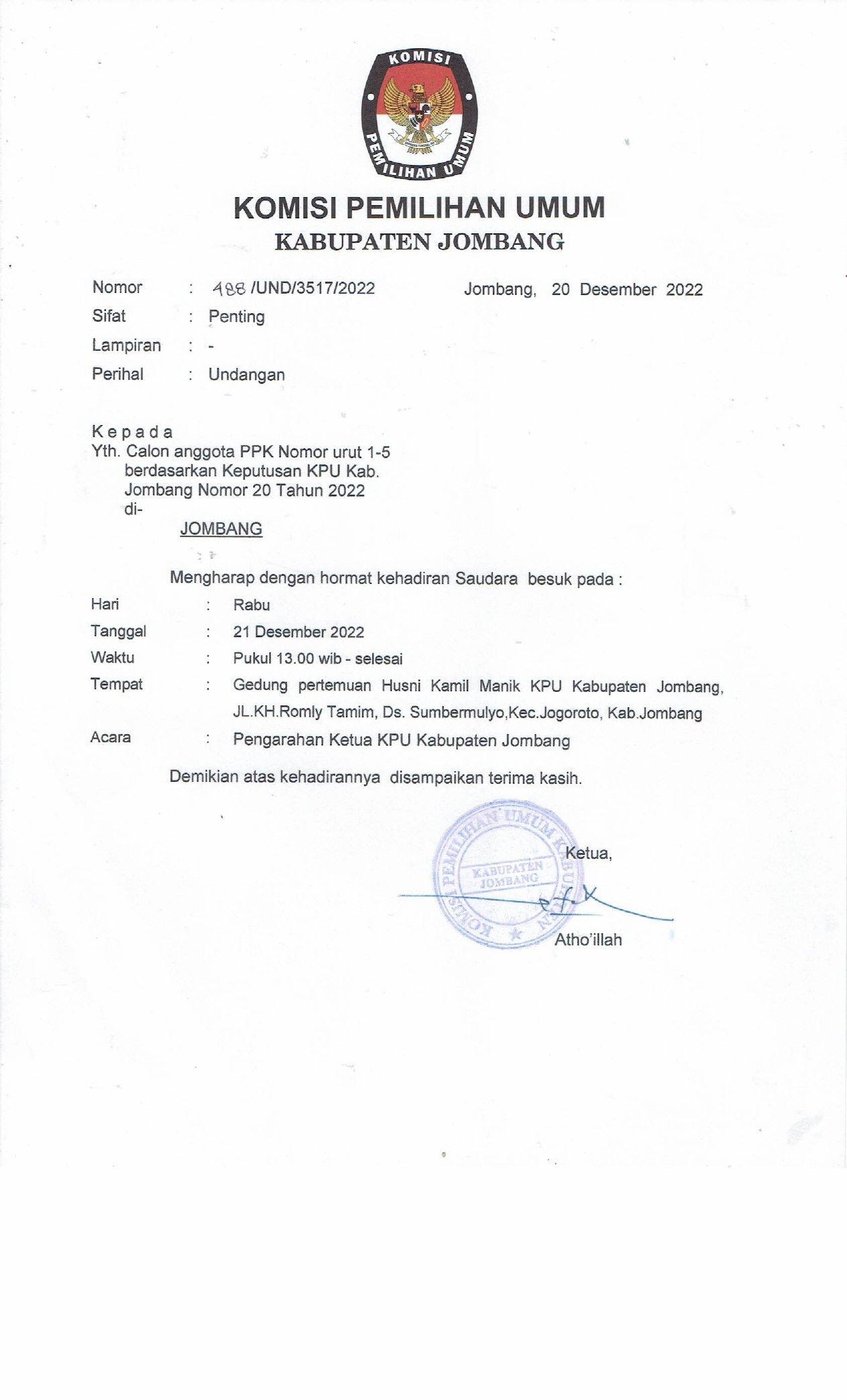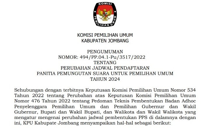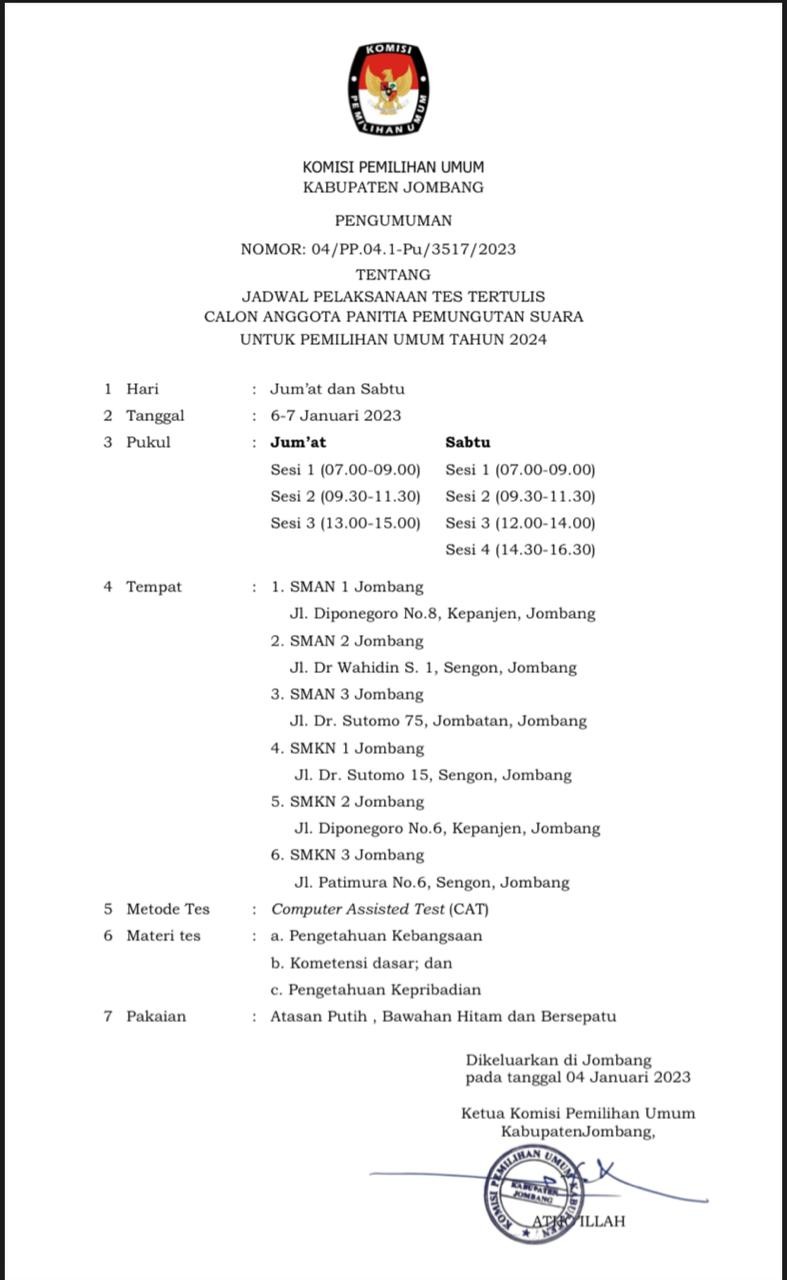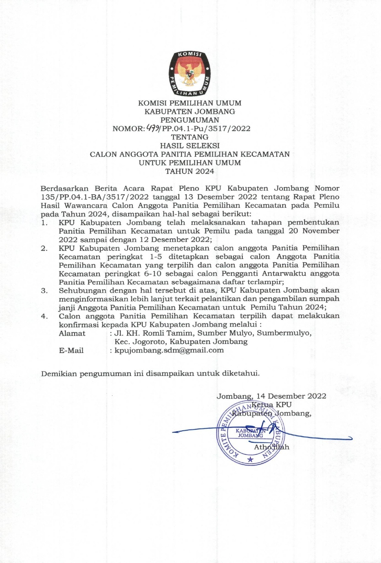 Berdasarkan Berita Acara Rapat Pleno KPU Kabupaten Jombang Nomor 135/PP.04.1-BA/3517/2022 tanggal 13 Desember 2022 tentang Rapat Pleno Hasil Wawancara Calon Anggota Panitia Pemilihan Kecamatan pada Pemilu pada Tahun 2024, disampaikan hal-hal sebagai berikut: