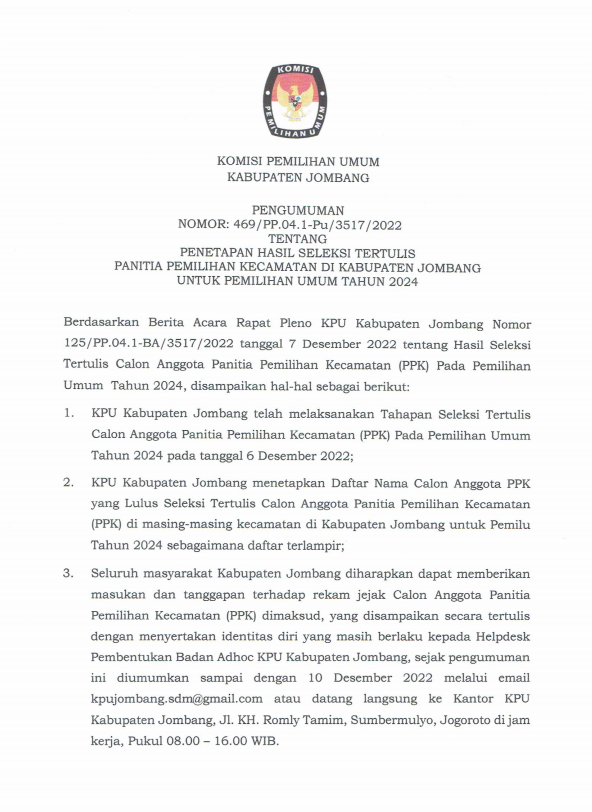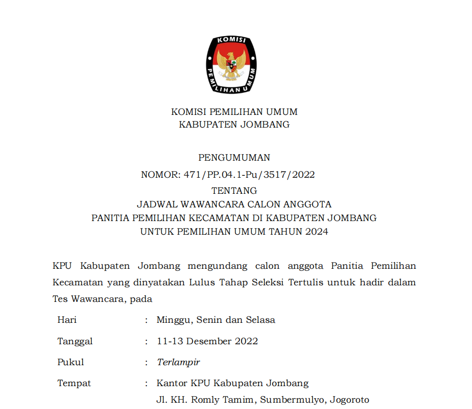 Bersama ini disampaikan Ralat Pengumuman No 456/PP.04.1-Pu/3517/2022 tentang JADWAL PELAKSANAAN TES TERTULIS CALON ANGGOTA PPK PEMILU 2024 bahwa pelaksanaan Tes Tulis CAT Gelombang 1 yang semula dilaksanakan mulai pukul 07.30-10.30 menjadi 07.30-10.00.