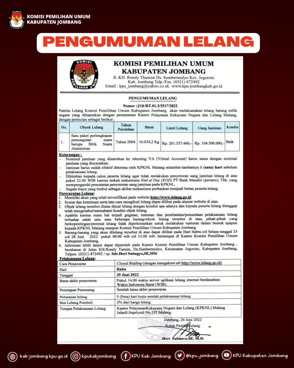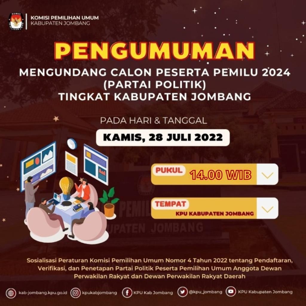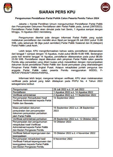 Jakarta – Komisi Pemilihan Umum mengumumkan Pendaftaran Partai Politik dan Penyampaian Dokumen Pendaftaran oleh Partai Politik pada, Jumat (29/7/2022). Pendaftaran Partai Politik akan dimulai pada hari Senin, 1 Agustus sampai dengan Minggu, 14 Agustus 2022 mendatang. Rilis selengkapnya dapat diunduh di sini