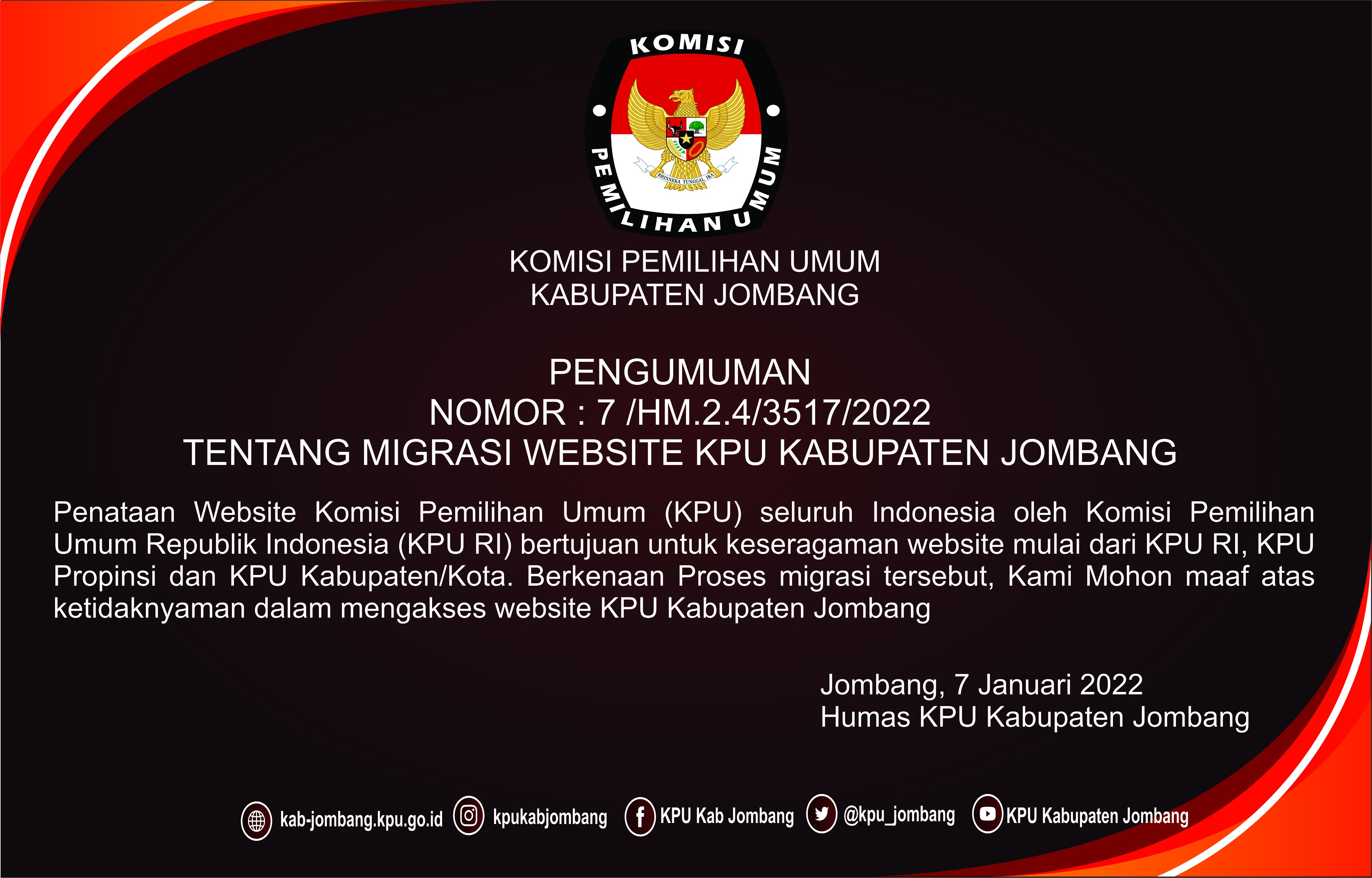 Penataan Website Komisi Pemilihan Umum (KPU) seluruh Indonesia oleh Komisi Pemilihan Umum Republik Indonesia (KPU RI) bertujuan untuk keseragaman website mulai dari KPU RI, KPU Propinsi dan KPU Kabupaten/Kota. Berkenaan Proses migrasi tersebut, Kami Mohon maaf atas ketidaknyaman dalam mengakses website KPU Kabupaten Jombang