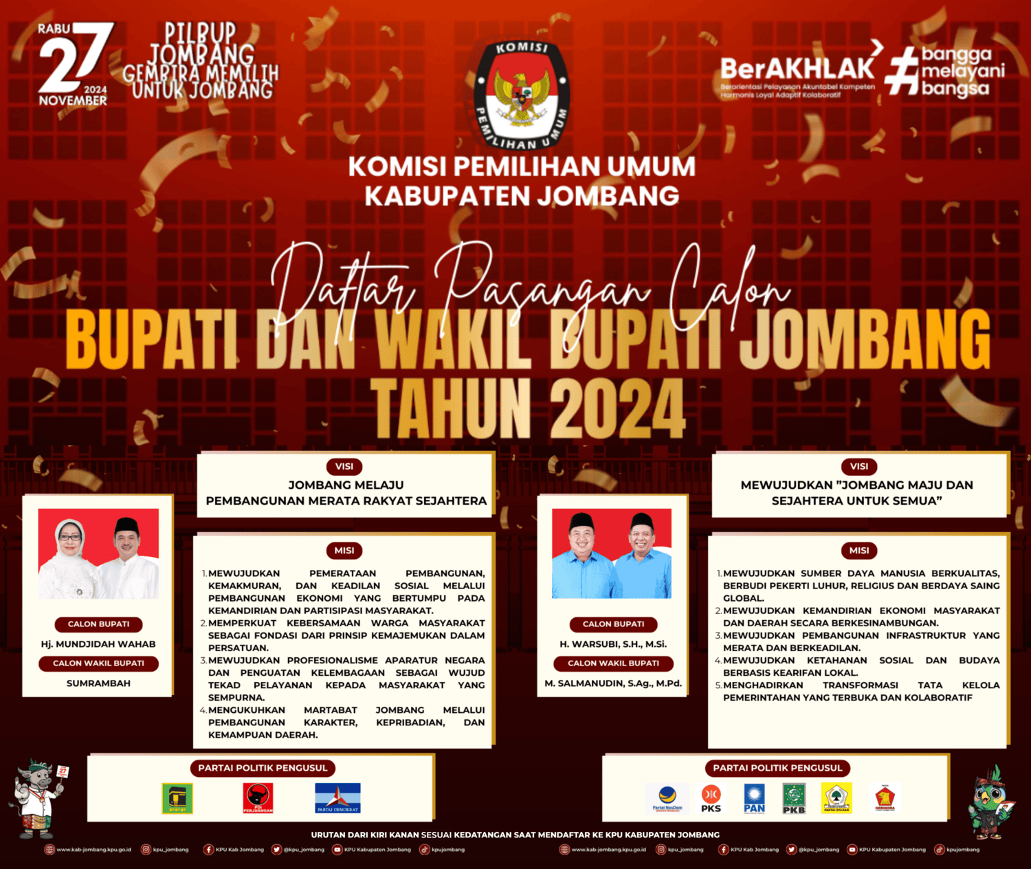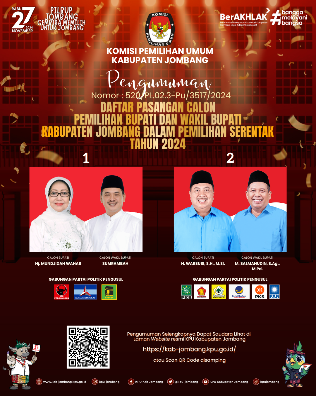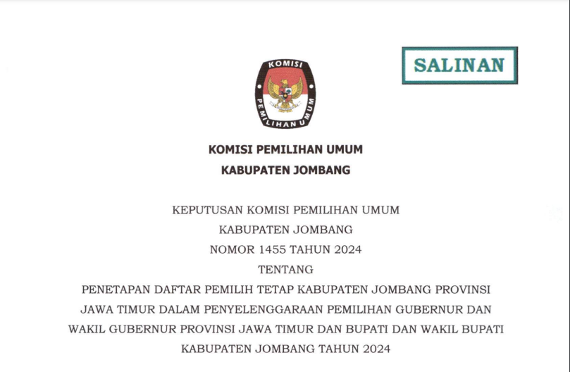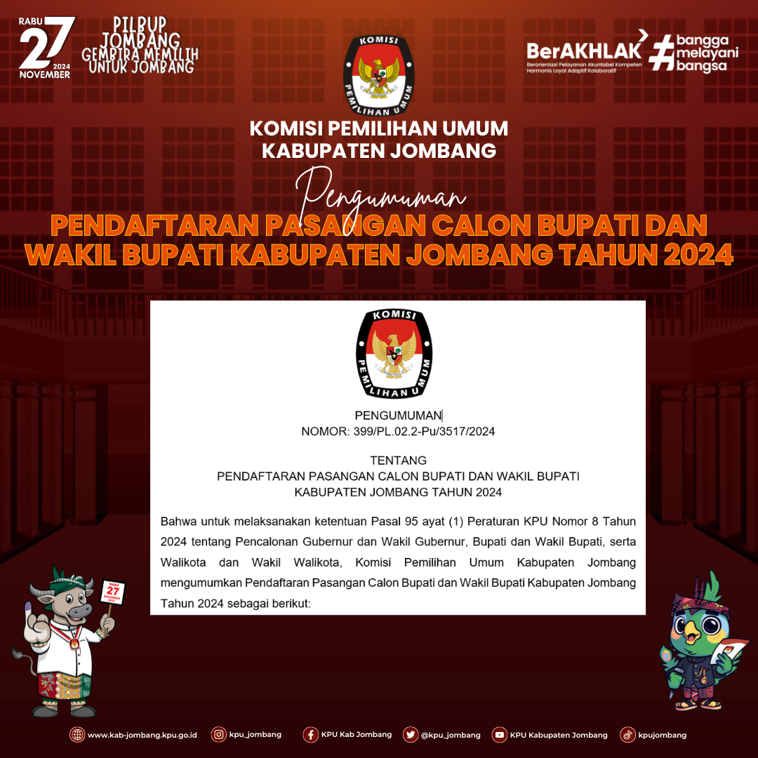 Berikut Kami Sampaikan Pengumuman Daftar Pasangan Calon Pemilihan Bupati dan Wakil Bupati Kabupaten Jombang dalam Pemilihan Serentak Tahun 2024