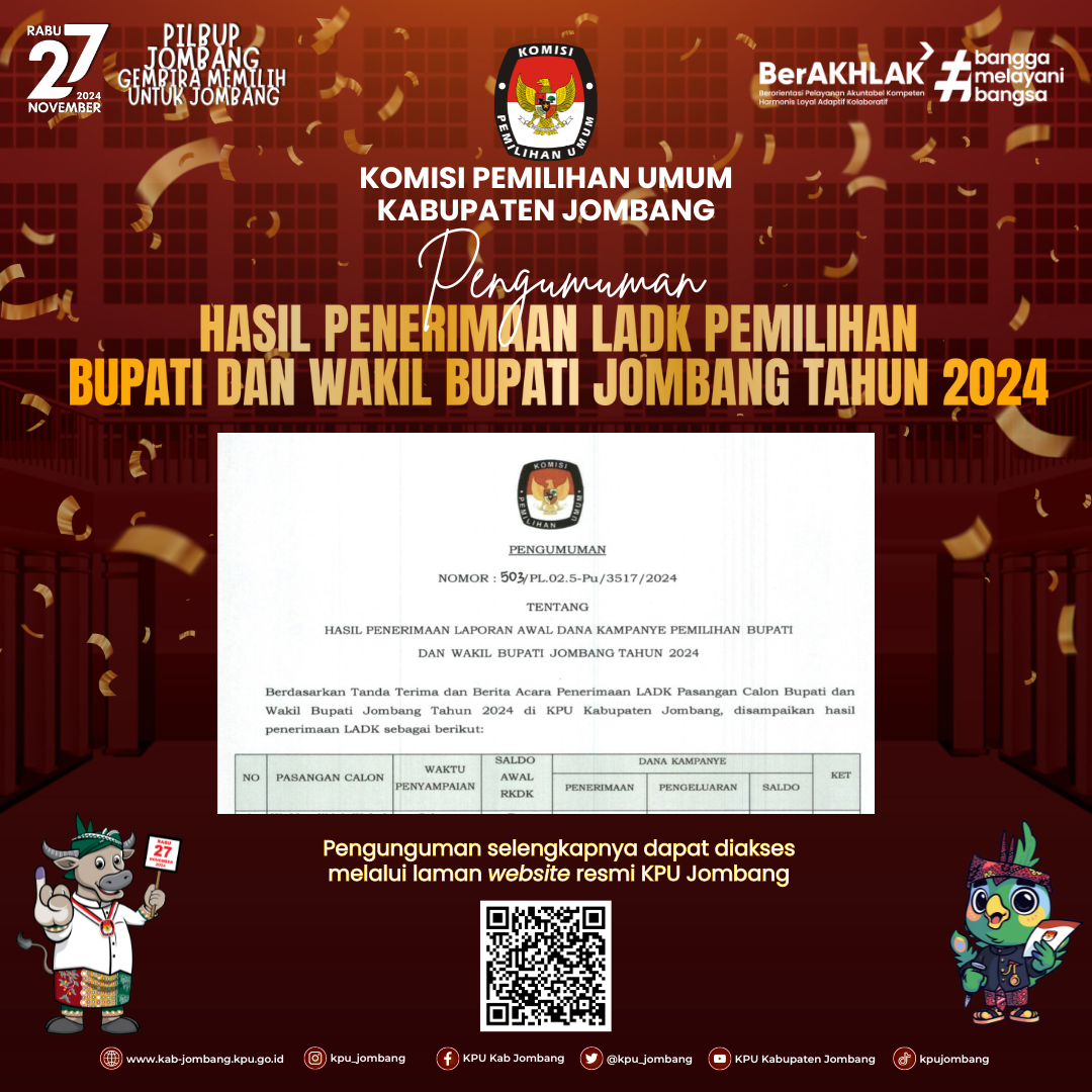Berikut Kami Sampaikan Pengumuman Hasil Penerimaan Laporan Awal Dana Kampanye Pemilihan Bupati dan Wakil Bupati Jombang Tahun 2024