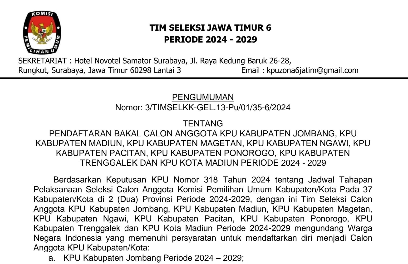 Pengumuman Pendaftaran Bacalon Anggota KPU Kabupaten Jombang Periode 2024-2029 Sabtu, 09 Maret 2024 13:00 328 Pengumuman Pendaftaran Bacalon Anggota KPU Kabupaten Jombang Periode 2024-2029 Selengkapnya Download di sini Baca Selengkapnya