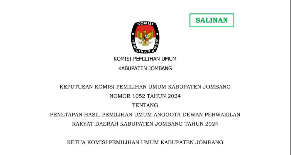 Keputusan KPU Kabupaten Jombang Nomor 1052 Tentang Penetapan Hasil Pemilu Anggota DPRD Kabupaten Jombang Tahun 2024 Minggu, 17 Maret 2024 13:00 601 Keputusan KPU Kabupaten Jombang Nomor 1052 Tentang Penetapan Hasil Pemilu Anggota DPRD Kabupaten Jombang Tahun 2024 Selengkapnya Download Di sini Baca Selengkapnya