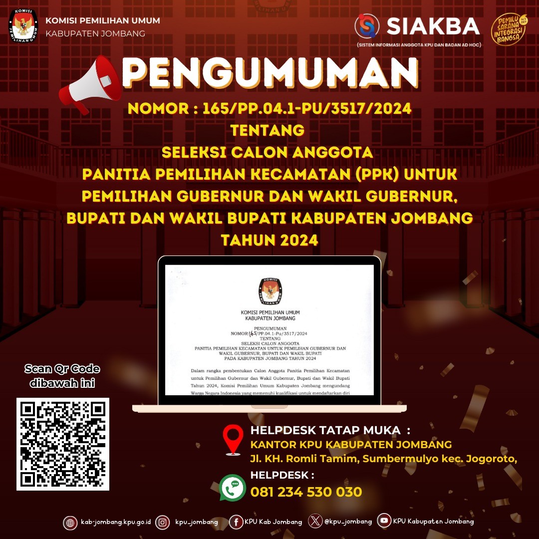 Pengumuman Seleksi Calon Anggota PPK Pemilihan Gubernur Dan Wakil Gubernur, Bupati Dan Wakil Bupati Pada Kabupaten Jombang Tahun 2024 Selasa, 23 April 2024 00:00 886 Pengumuman Seleksi Calon Anggota PPK Pemilihan Gubernur dan Wakil Gubernur, Bupati dan Wakil Bupati Pada Kabupaten Jombang Tahun 2024 Selengkapnya Download di sini Baca Selengkapnya